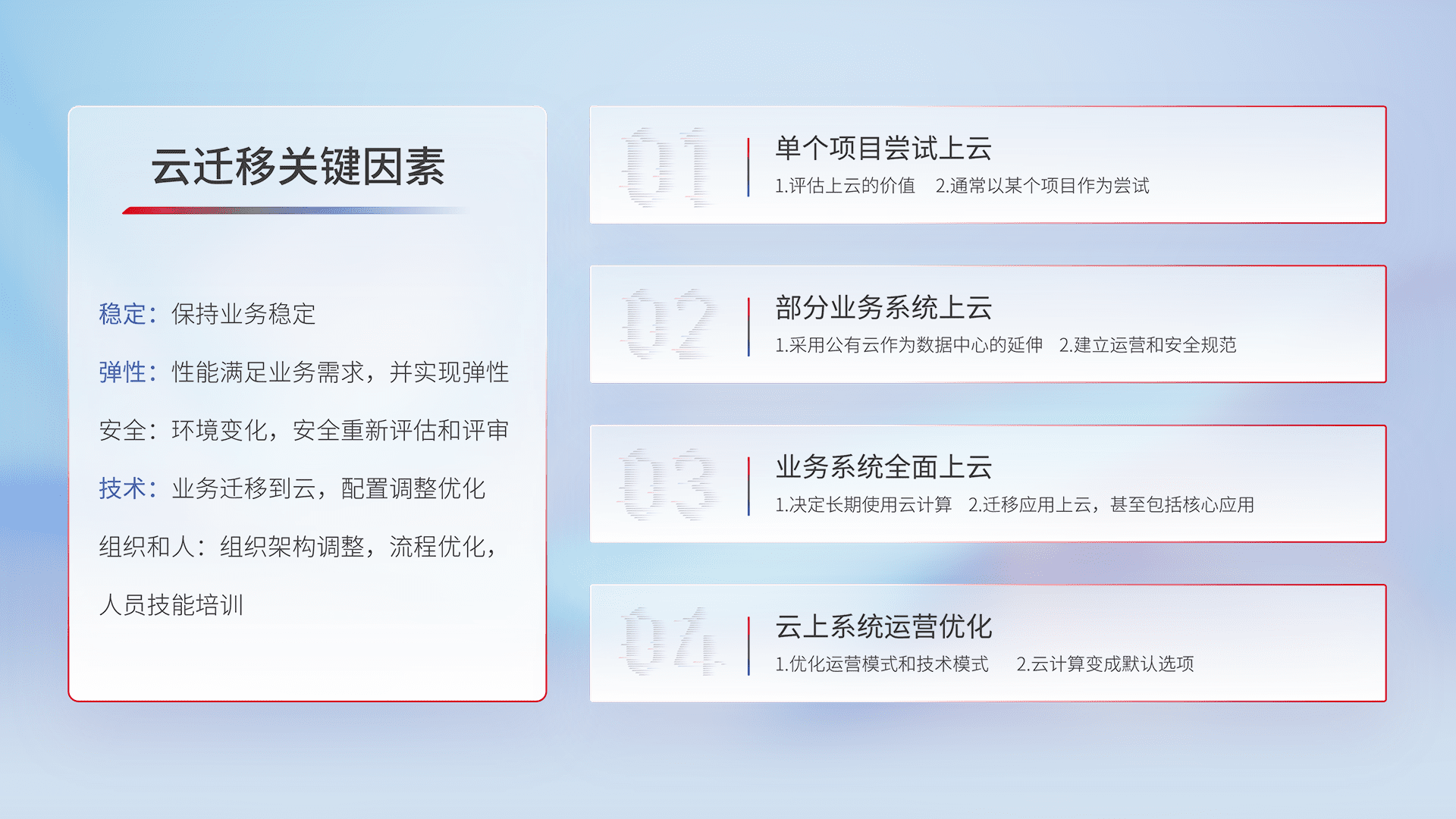 结合实际业务,,,从规划设计、、云平台选型、、云原生改造、、、、数据迁移、、、、集成交付,,迁移全过程为客户识别最佳上云路径,,,做好风险识别管理,,,,设计网络架构、、、身份权限、、安全审计合规、、、、操作审计、、、、日志审计、、监控告警策略、、、、多站点容灾设计等,,对云上基础设施进行整体规划,,提升IT治理水平,,以满足弹性、、、、高可用、、、、高性能的需求。。