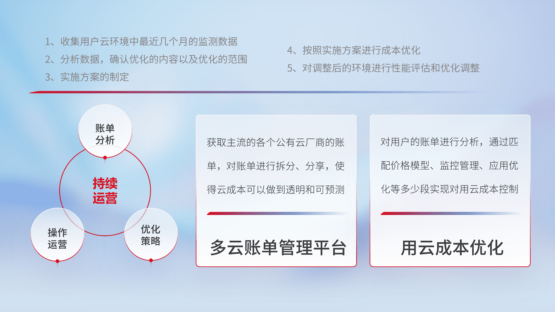 通过多云纳管,,,,以统一的资源数据模型把客户的云资源进行抽象和封装,,进而实现对多云资源的统一操作,,,保障云资源管理的可靠性、、、稳定性与可用性。。。量身定制化运维内容,,配置、、、、开发运维、、、补丁管理、、、备份、、、、监控、、认证和访问管理、、、审计和日常巡检等,,,保障在用云过程中的可靠度,,稳定度以及高可用率。。。